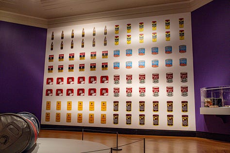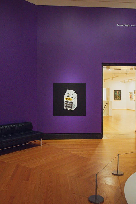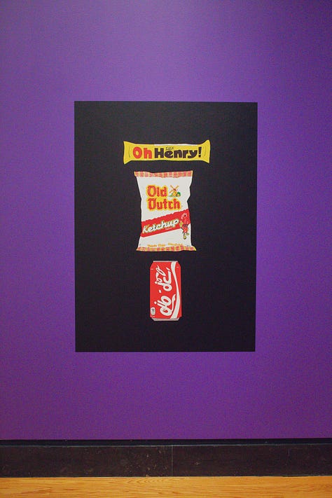 I didn’t interject because I try to abide by a civil social contract that precludes me from inviting myself into the conversations of others, but the scruffy man wasn’t wrong: the most straightforward, knee-jerk comparison to Tarralik Duffy’s pop art, which is the focus of this show, is the late Andy Warhol. Both artists’ work employ the immediately accessible imagery of popular commodities as kickstarters for examination—Warhol’s 1960s Campbell’s Soup cans are Duffy’s Pepsi and Red Rose Tea. But the similarities end, more or less, at aesthetics. While Warhol used his projects to outwardly critique—to dissect societal valuations of art, the boundaries between high art and low culture, the transitory nature of beauty and celebrity—Duffy approaches her subject as a deeply personal and imaginative nostalgia. The items rendered here are lifted from Duffy’s childhood in Nunavut—objects that she notes have come to permeate contemporary Inuit life. Warhol’s pop art—emerging out of the post-war consumer boom, a reaction to abstract impressionism—worked to recentre art around a depersonalized, objectified iconography. Duffy utilizes these pop art aesthetics to instead present something fundamentally opposite: a deeply personal, narrative work that prods at the presence of these commodities as dominant figures in Inuit communities.