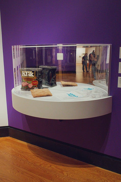Though the dim, sparse lighting of the rotunda dulls her bright, primary colours, and despite the glass cages holding her youthful sculptures rendering them like ancient artifacts, Duffy’s work remains chiefly joyful. It emphasizes the Inuit identity as one capable of maintaining and adapting cultural traditions throughout unmitigated and disastrous circumstances and history, yet it rejects offering relief or pandering to Western audiences by continuing to invite examination. I was drawn to Duffy’s work because of our shared history with canned meats—I grew up eating Maple Leaf Vienna Sausage, which lines one of the shelves of her mural; instead of Klik Luncheon Meat, my family indulged in Spam. I think there is a whole unwritten history of these products, and how their export connects many disparate communities across the world. But as I imagine sharing a meal of perishable canned foods with loved ones, I realize that I am, in fact, just offering myself relief from the vulnerability of self-examination. As for the girl who asked about the soda pop laying knocked over on the rotunda floor? No one answered her question. They just kept walking through.