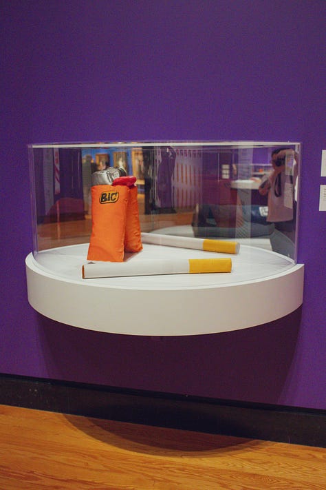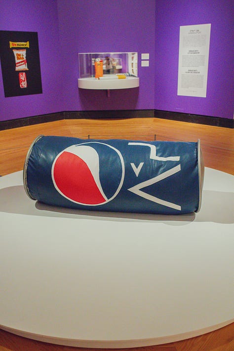 Tarralik Duffy’s first solo show at the AGO, “Let’s Go Quickstop”, is situated in the Fudger Rotunda on the ground floor. Sitting on one of the room’s leather benches to catch my breath, I can’t help but overhear two independent critics. First, a disheveled scholar in his early twenties who marches straight to Duffy’s towering mural: a large-scale digital illustration of grocery items arranged in an 8x12 grid, each item perfectly faced like the shelves of a newly-opened supermarket. The student contemplates for a second, then remarks to his friend: “Warhol.” Shortly after, a little girl about 5 years old strolls through from the adjoining gallery. She becomes fixated on the show’s centerpiece: a large soft sculpture of a soda can, about twice her physical size. She tugs on the arm of her accompanying guardian: “Why is there a giant Pepsi on the floor?”